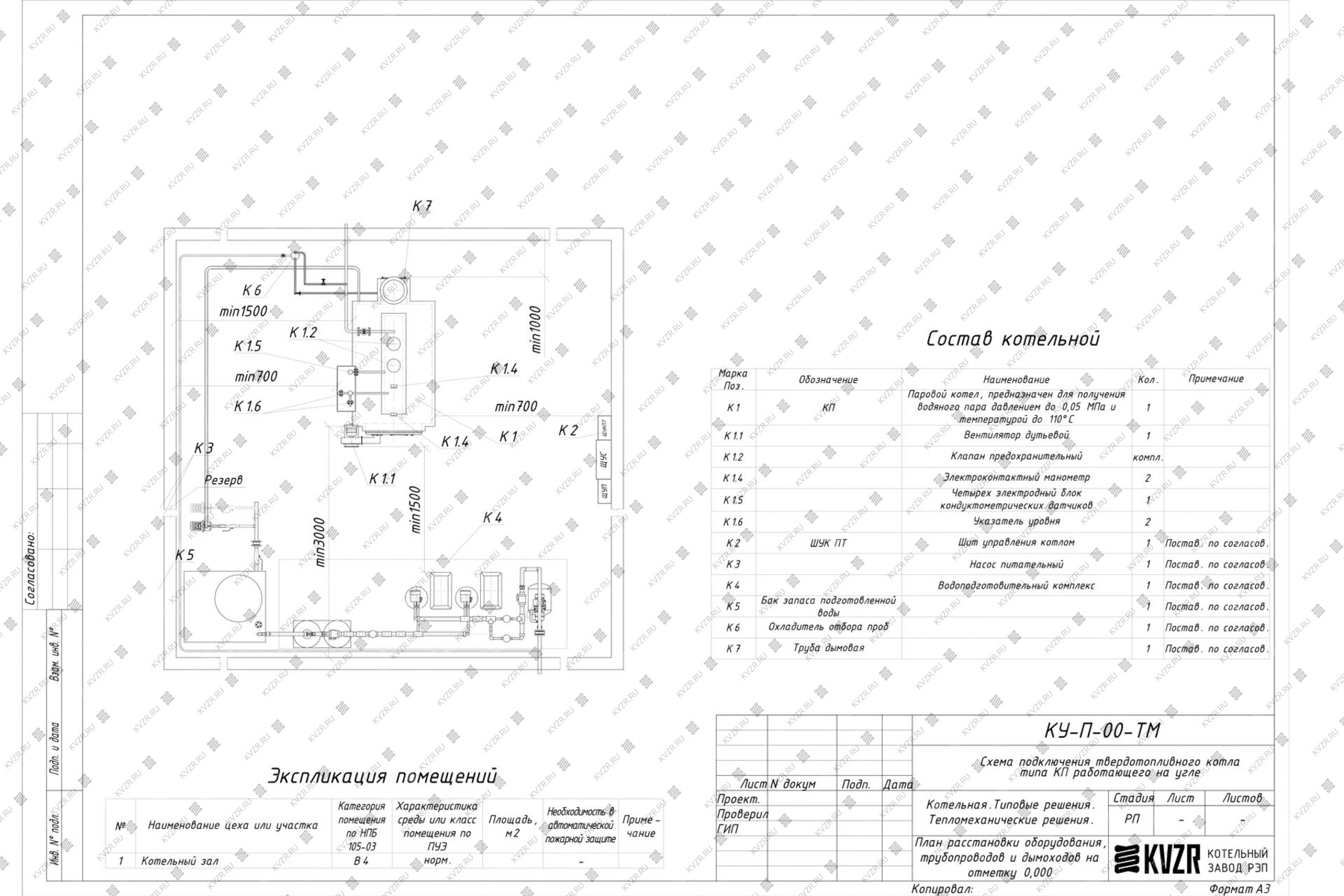 К фронтовой плите крепится воздуховод и вентилятор для подачи воздуха в топку котла под слоевую решетку. На задней крышке котла парогенератора КП 1000 в основании дымовой трубы выполнен предохранительный взрывной клапан. Образующиеся в топочной камере продукты сгорания проходят конвективный пучок труб и выводятся через трубу дымовую, установленную на корпусе в хвостовой части котла. При работе круглый парообразователь КП 1000 подпитывается водой для образования пара через штуцер. Подпитка котла ведется из питательного бака насосом через соединительную арматуру. На трубопроводе подпитки котла водой должно быть установлено запорное устройство и обратный клапан. Запорное устройство располагается между паровым котлом КПр 1000 и обратным клапаном.
