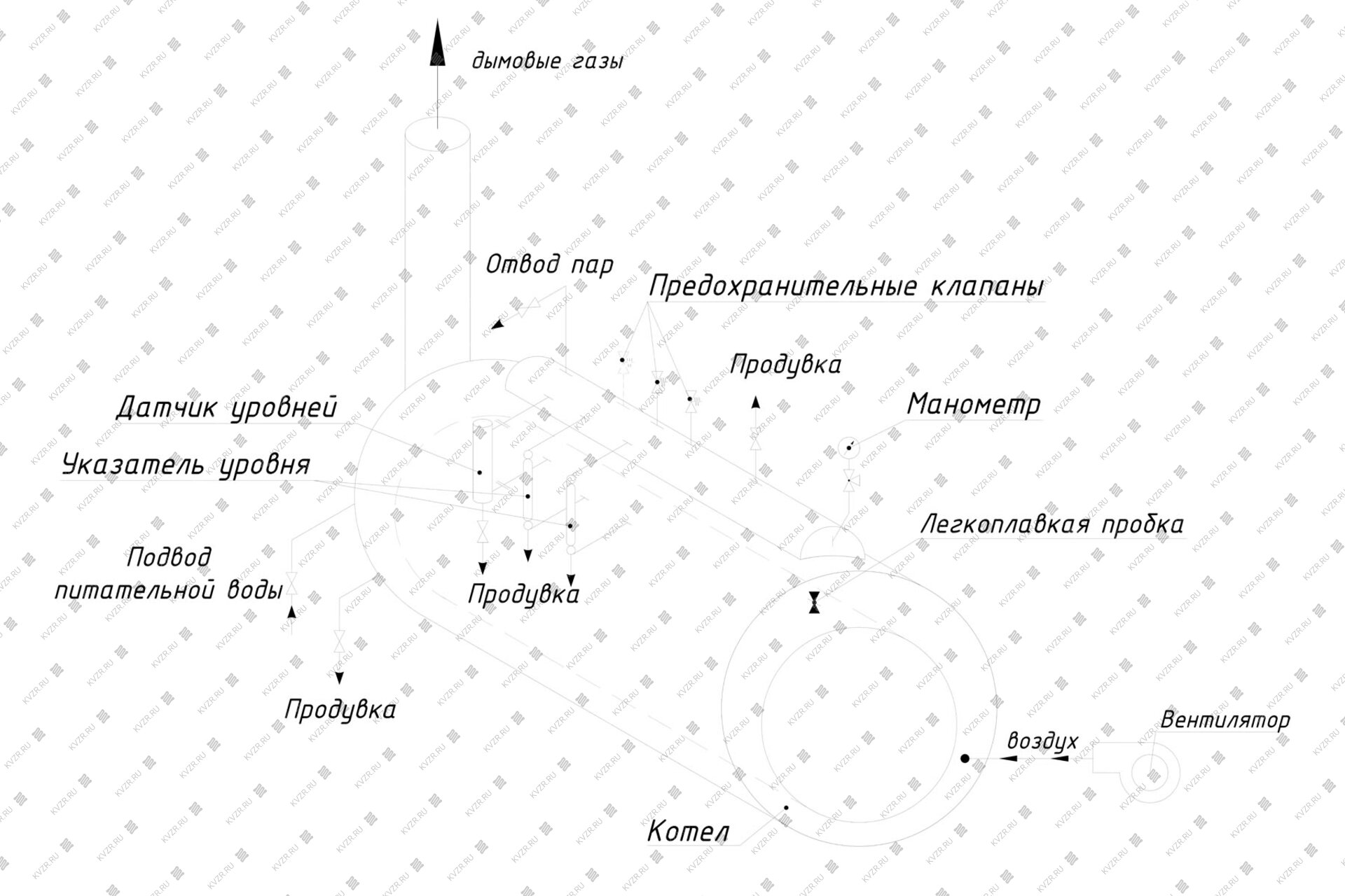 Согласно правилам, для подпитки устанавливается не менее двух питающих насосов, один рабочий и второй резервный. На стороне нагнетания каждого центробежного насоса до запорного органа должен быть установлен обратный клапан. На трубопроводе выдачи пара, в непосредственной близости от котла, устанавливается запорное устройство. На котле имеются продувочные штуцера Ду25, Ду15 и Ду10. Нижний штуцер Ду25 предназначен для удаления шлама, образующегося в результате работы котла, периодической продувки котловой воды и для спуска воды в случае необходимости. Штуцер Ду15 предназначен для продувки водомерной колонки. Штуцера Ду10 предназначены для продувки указателей уровня.