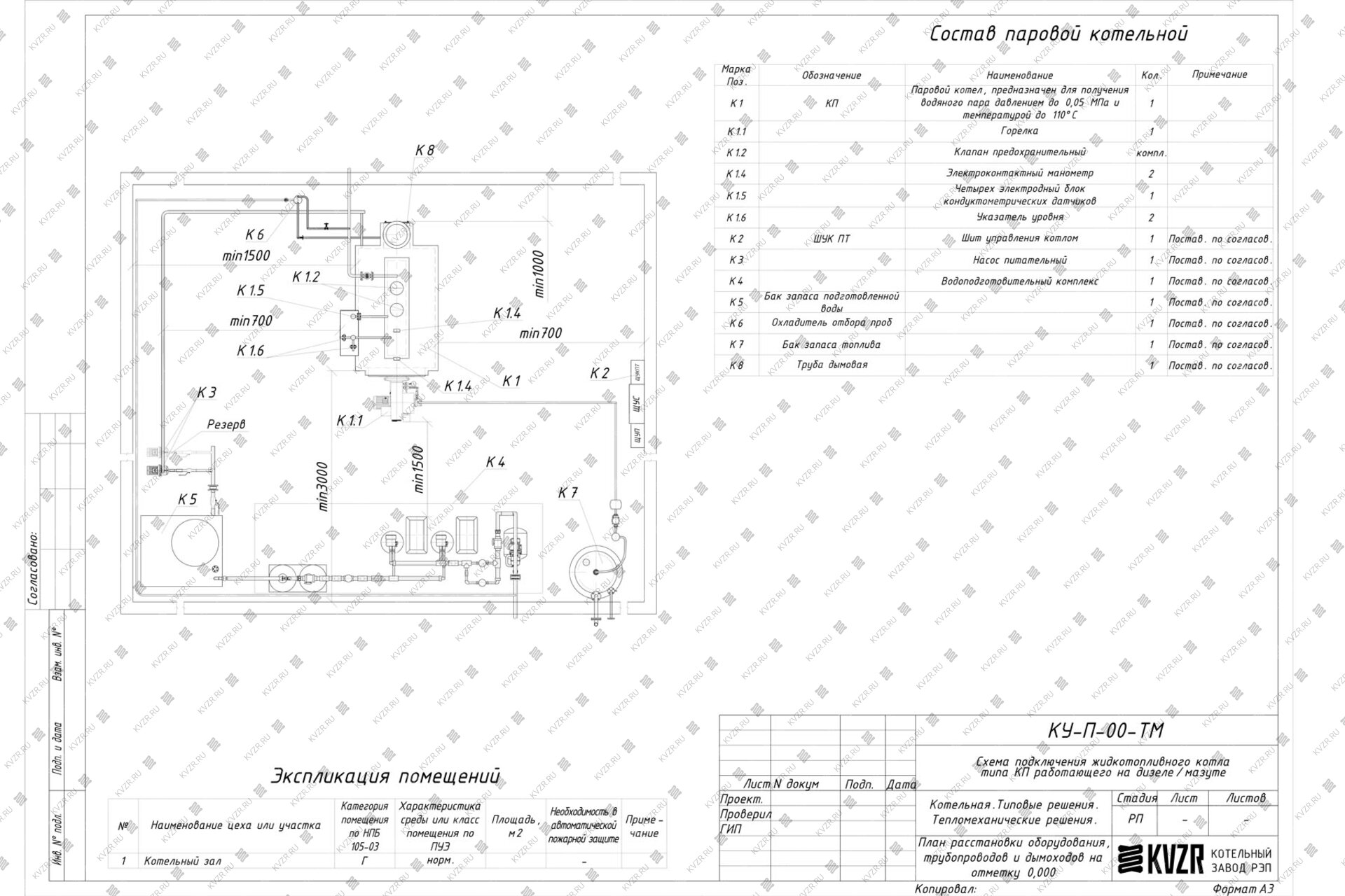 Монтаж парового котла КП 2500 на мазуте в котельной должен производиться в соответствии с проектом и с учетом требований Свода правил СП 89.13330. 2016 «Котельные установки» и «Правил устройства и безопасной эксплуатации паровых котлов с давлением пара не более 0,07 МПа (0,7 кгс/см2), водогрейных котлов и водоподогревателей с температурой нагрева воды не выше 388 К (115 С)». Правильный монтаж котла – залог его надежной и долгой работы.