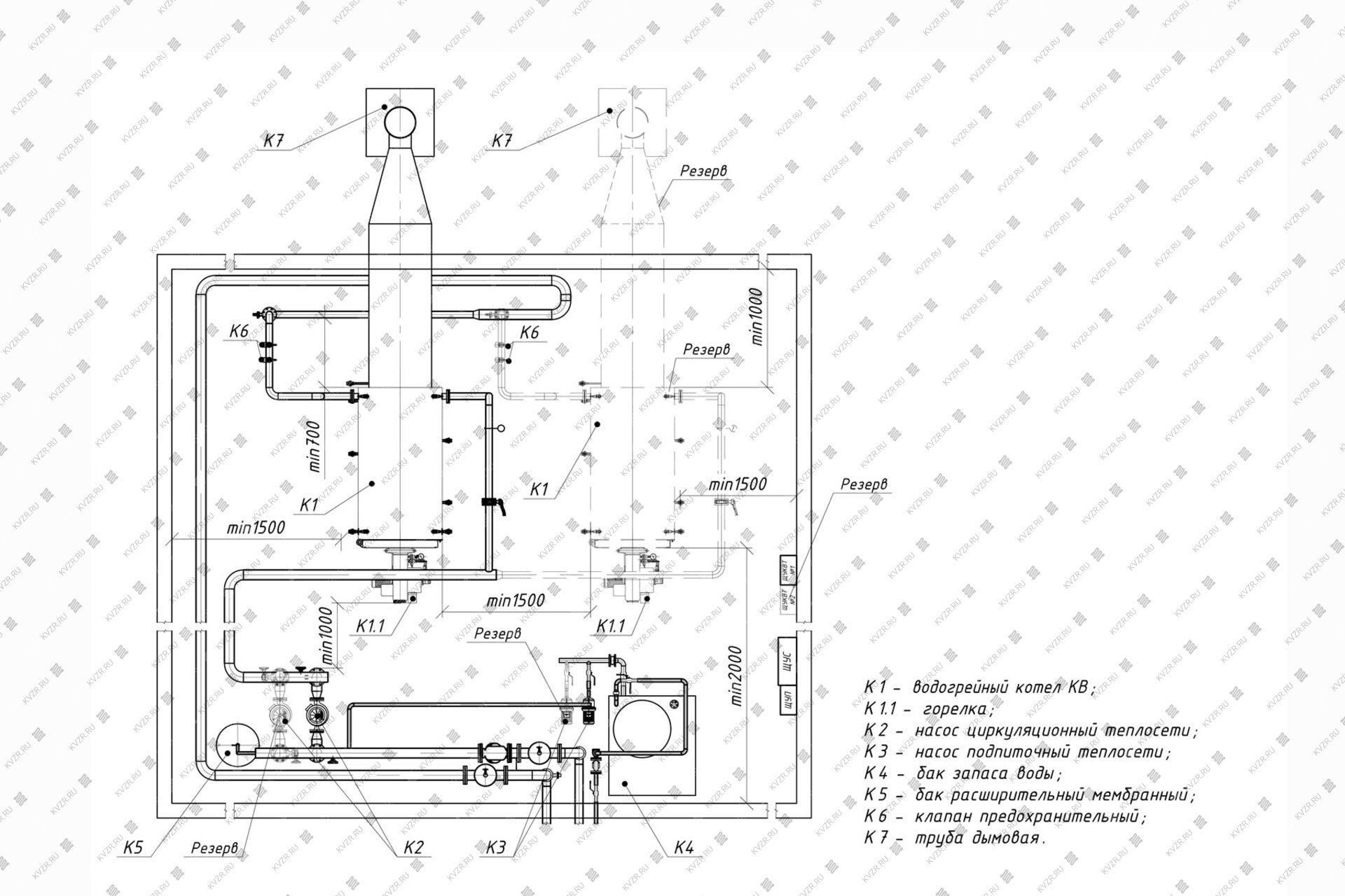 Чтобы правильно подключить котел КВа 0,6 в котельной необходимо оставить проемы для обслуживания оборудования во время эксплуатации. На представленной здесь схеме указаны их минимальные размеры. Кроме того, в данной примерной схеме монтажа водогрейных котлов и оборудования указан перечень минимально необходимого вспомогательного оборудования для правильной работы котла.