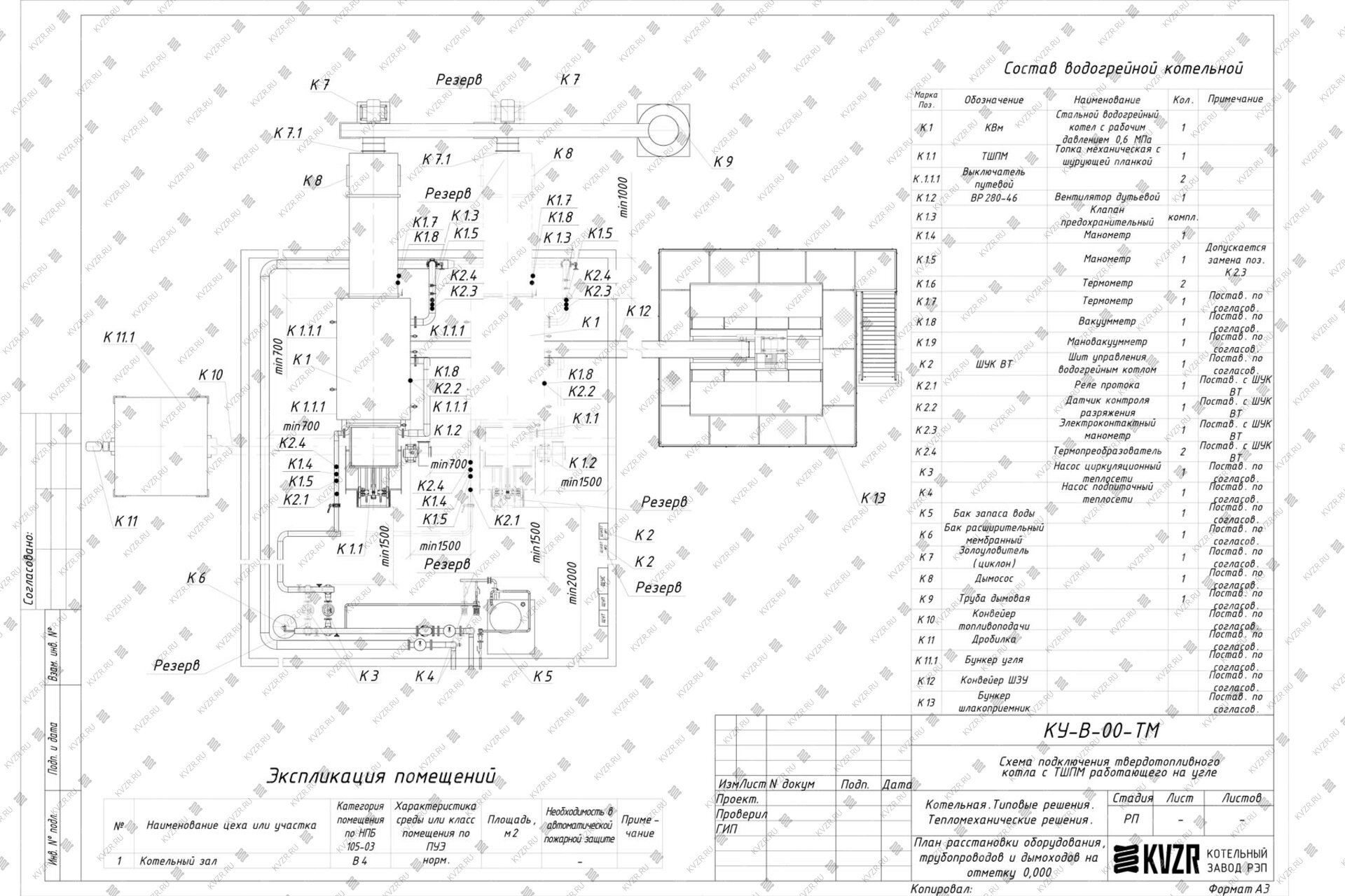 Для эффективной и надежной работы котла КВм-1,25 с ТШПМ в вашей котельной вам потребуется дополнительное оборудование - автоматика ЩУК, дымосос, насос сетевой и подпиточный, золоуловитель (по желанию), транспортеры, газоходы и переходники для газового тракта, дымовая труба. Мы предлагаем рассмотреть типовые варианты комплектации.