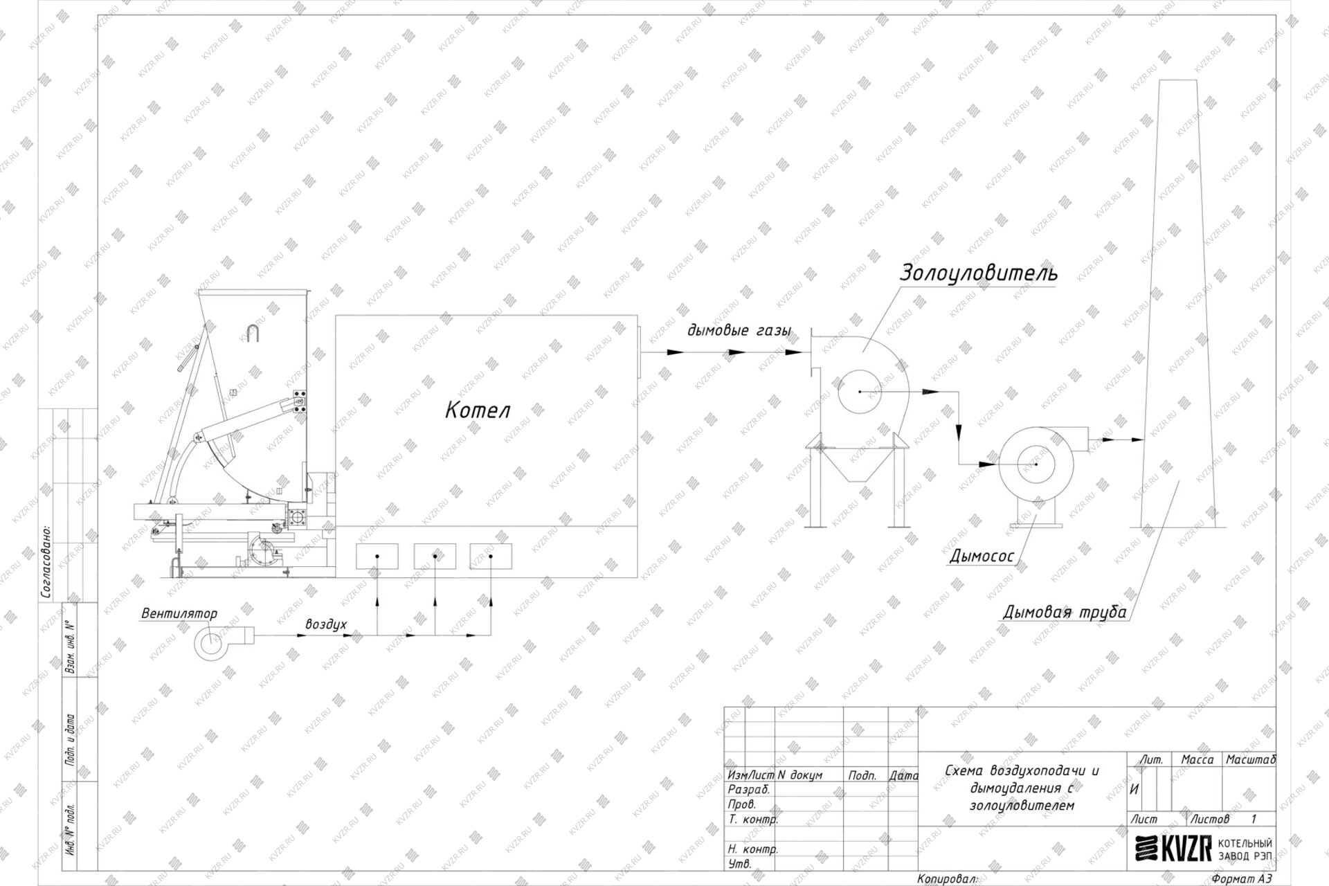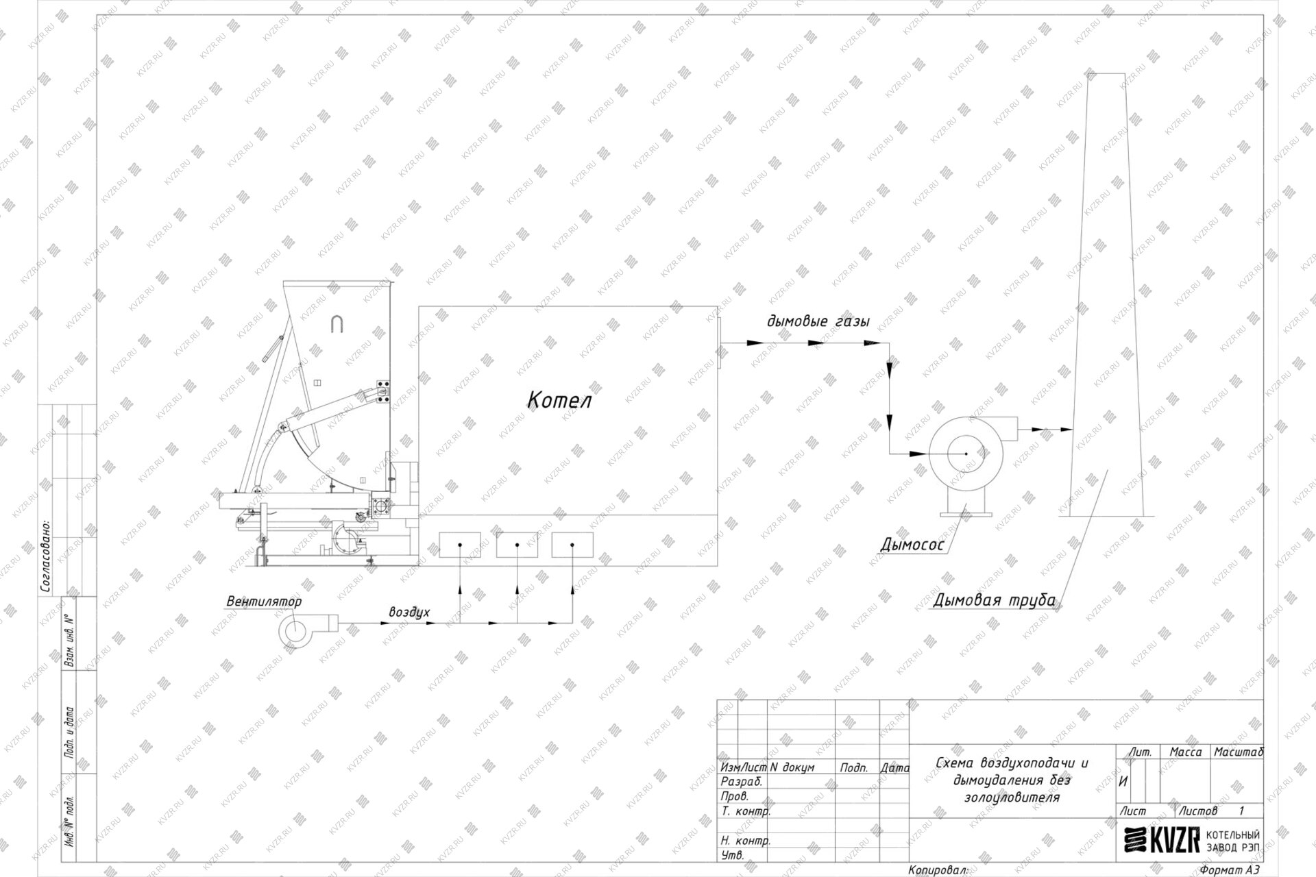 В случае, если степень очистки дымовых газов высокая не требуется, можно установить котел КВм-1.25 с ТШПМ без золоуловителя. Схема подключения при этом следующая - дымовые газы выходят из котла в газоходы котельной, затем в дымосос и далее снова по газоходам в дымовую трубу. В зависимости от компоновки котельной дымосос может устанавливаться как в котельной, так и на улице. Наш завод производит газоходы и переходники к ним. Получив схему вашей котельной мы можем изготовить для вас комплект газоходов, переходников нужных размеров и сечений. На месте такие детали собираются как конструктор. Обращаем ваше внимание, что газоходы требуют изоляции, для защиты персонала от ожогов, так как уходящие газы имеют высокую температуру, а на улице газоходы требуют изоляции для избежания образования конденсата.