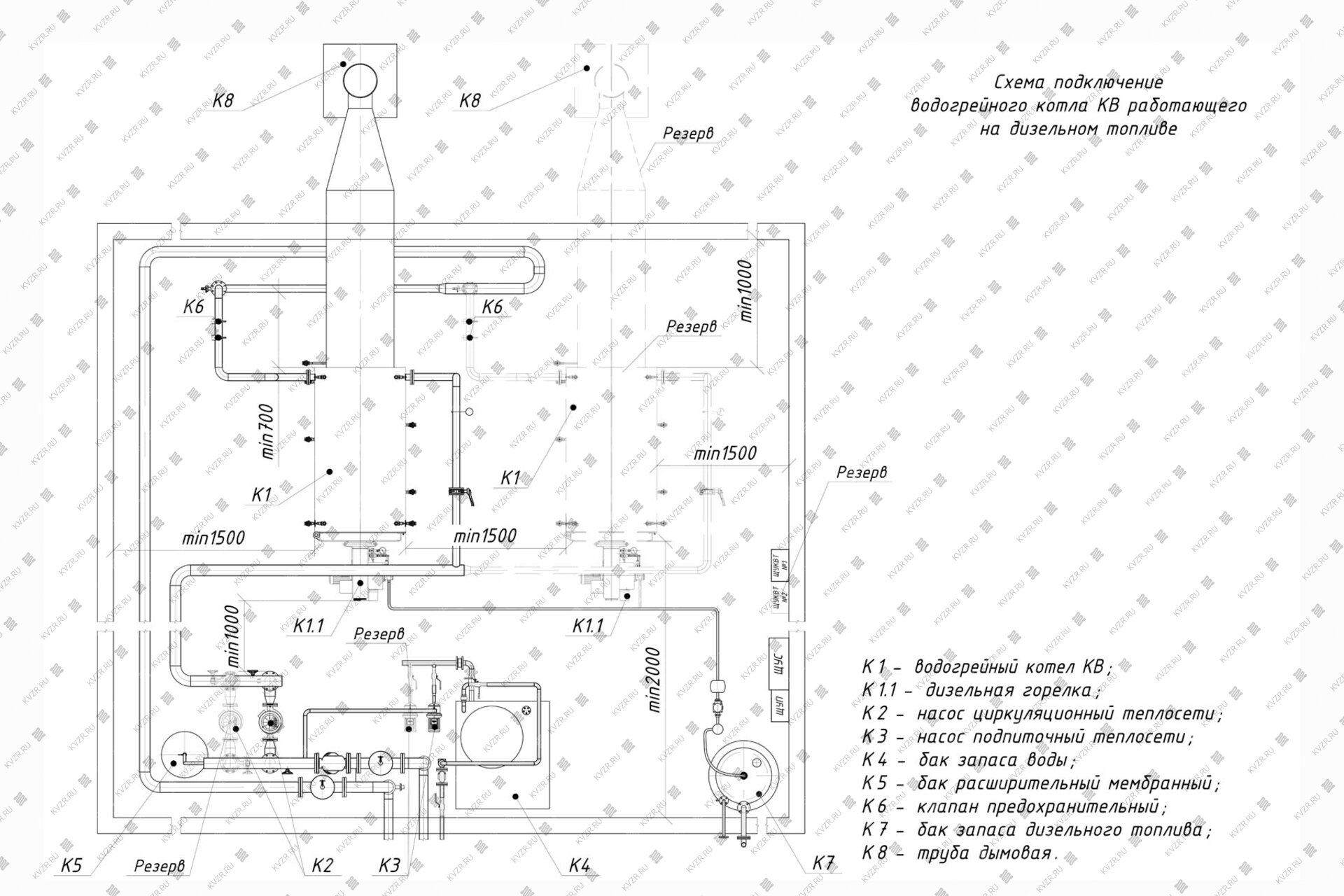 Чтобы правильно подключить котел 0.8 МВт на дизеле в котельной необходимо оставить проемы для обслуживания оборудования во время эксплуатации. На представленной здесь схеме указаны их минимальные размеры. Кроме того, в данной примерной схеме монтажа водогрейных котлов и оборудования указан перечень минимально необходимого вспомогательного оборудования для правильной работы котла.