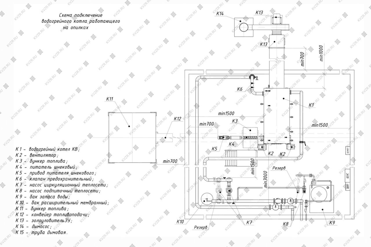 Котел на опилках для отопления изготавливается водотрубным стальным с бункером для сырых опилок, плунжерным питателем, вихревой топкой, котельного блока с топочной камерой для горения опилок и конвективными пакетами для нагрева воды до требуемой температуры.